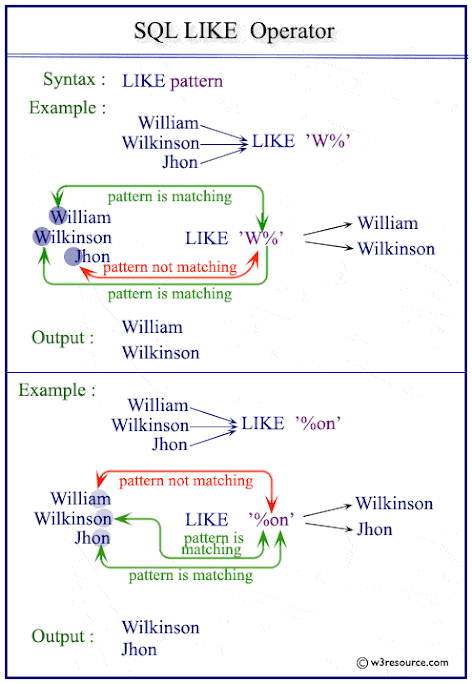 يستخدم SQL أحرف البدل، '%' و '' ، لمطابقة الأنماط في البيانات النصية. يمثل '%' أي عدد من الأحرف، بينما يمثل '' حرفًا واحدًا. يعد هذا مفيدًا للعثور على البيانات التي تطابق نمطًا معينًا.